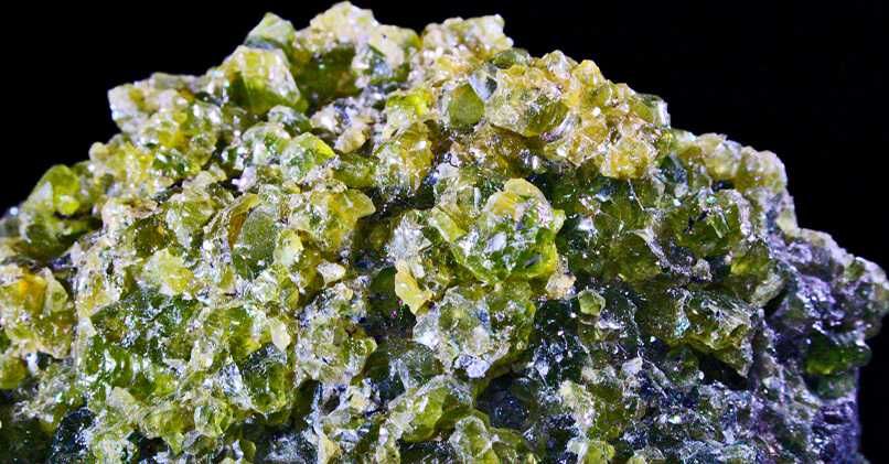Основными отличительными признаками камня являются оливково-зеленый цвет, неметаллический блеск, а также содержание в темных породах магматического происхождения.