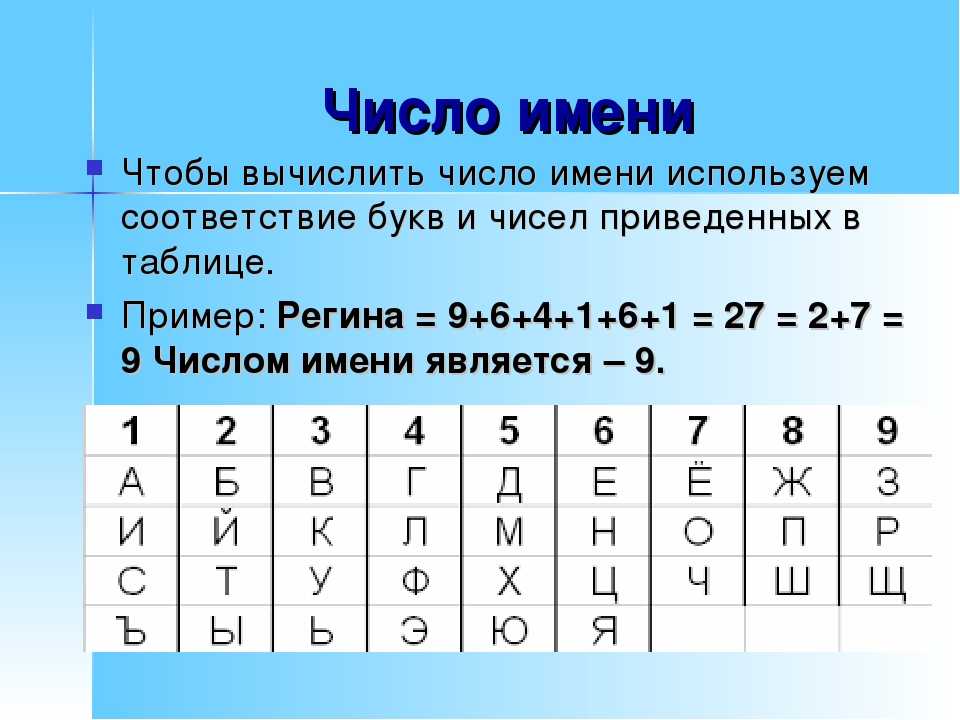 Сложив все цифры, соответствующие каждой букве полного имени, должно получится двухзначное число. После чего следует прибавить эти две цифры. Полученное число и есть результат. К примеру: