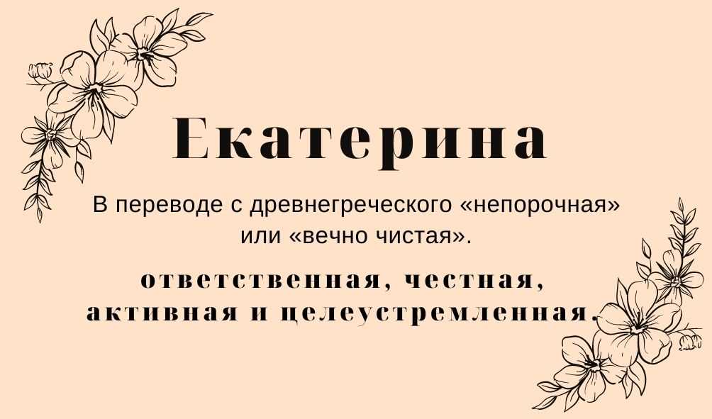 Имя Екатерина имеет греческие корни, переводится как благочестивая и непокорная. На Руси происхождение имени распространилось, когда царь-батюшка Алексей Михайлович назвал свою новорожденную дочь Екатериной. До этого периода оно считалось редким. Имя царем для дочери было взято накануне ее рождения, во сне явилась святая Екатерина Александрийская. Ему показалось, что сон был неслучайный и значимый, память о нем живет до сих пор.