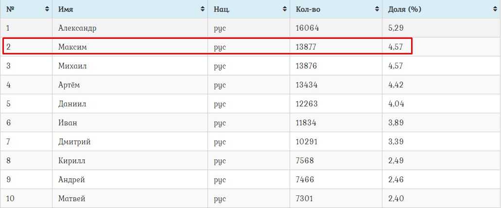 Согласно порталу открытых данных правительства Москвы data.mos.ru в период 2015-2019 год именем Максим назвали 13877 мальчиков (2-е место по популярности).