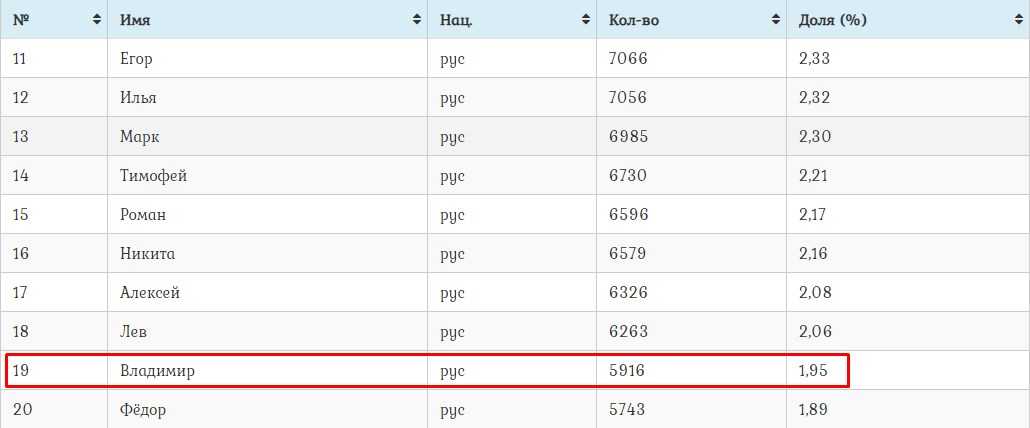 Согласно порталу открытых данных правительства Москвы data.mos.ru в период 2015-2019 год именем Владимир назвали 5916 мальчиков (19-е место).