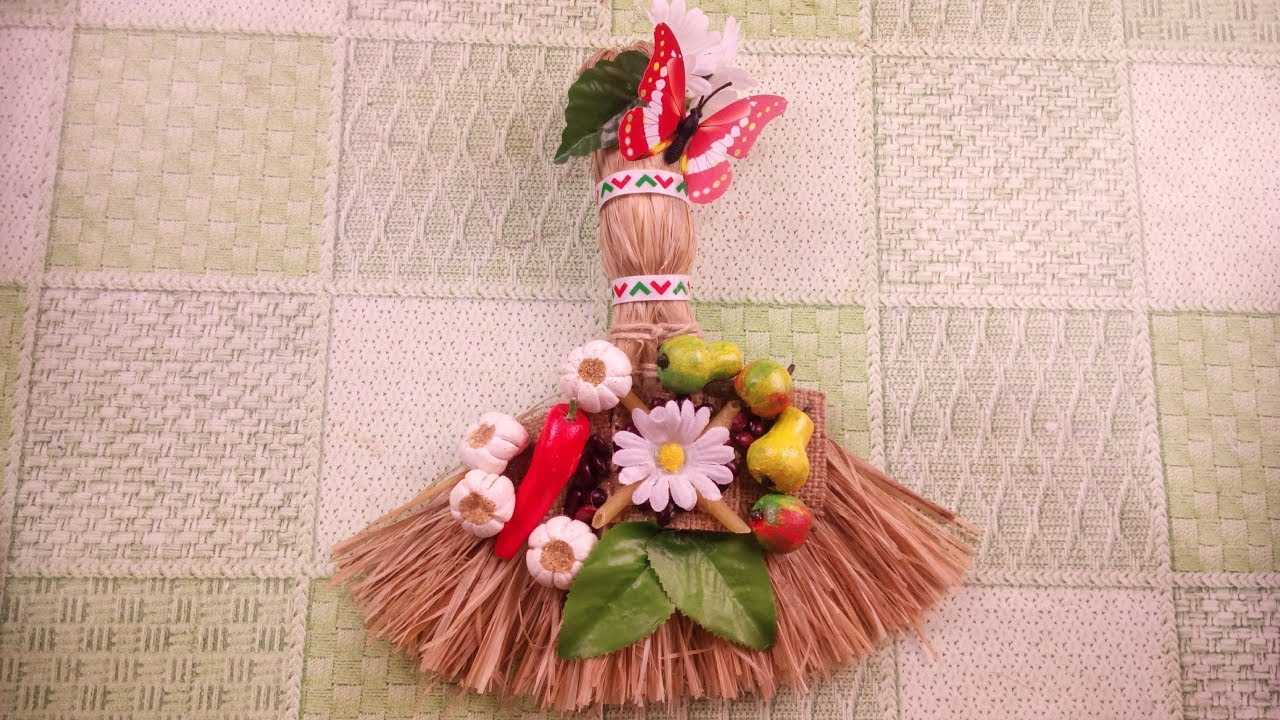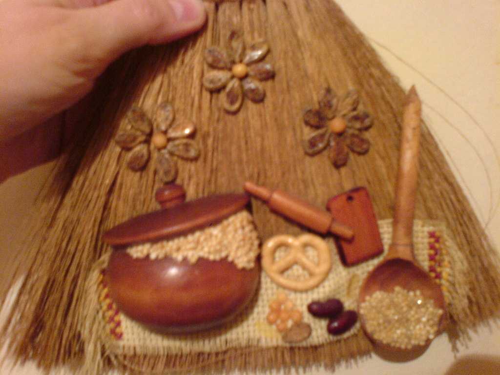 Сделать декорации на обережный веник можно из соленного теста, дерева, глины, семян растений, круп. Для сохранности композиция покрывается лаком.
