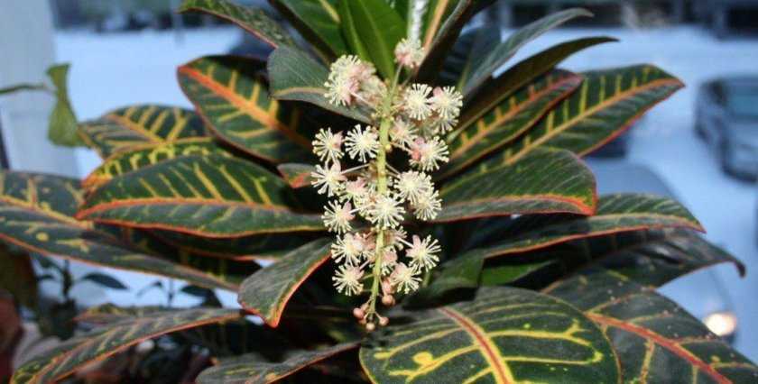 Появившиеся цветочные почки или молодые цветоносы желательно удалять, потому что цветение, не имеющее декоративной ценности, изнуряет кротон, и это отражается на здоровье и красоте его листьев.