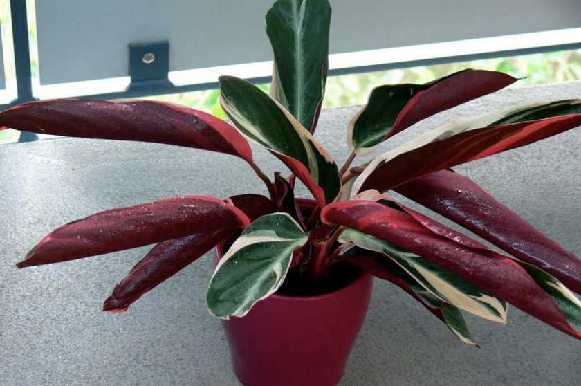 Строманта — растение высотой до 60-80 см, похожее на маранту, но по окраске листьев больше напоминающее калатею. Строманта обладает красивыми довольно крупными овальными листьями длиной 15-35 см. Фон у листьев разнообразен — зеленые или пестрые, с изящным атласным блеском, нижняя часть пластинки бардовая. Строманта, пожалуй, самая капризная из этого семейства.